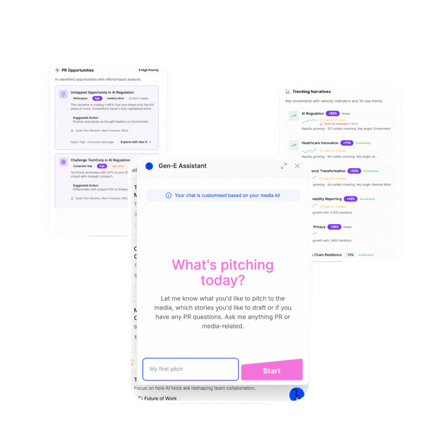Press releases, pitches, opinion pieces drafted in your words, in minutes. No more asking ChatGPT to rewrite again. And again. No more staring at a blank page.